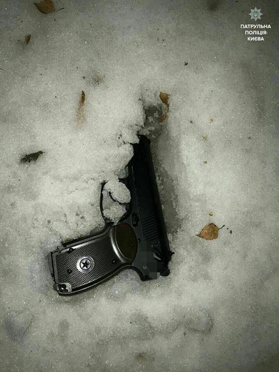 За 20 хвилин патрульні виявили вказаний автомобіль на перетині вулиць Кирилівської та Петропавлівської, й одразу почали його переслідувати. Уже на перехресті вулиць Копилівської та Петропавлівської охоронцям порядку вдалося заблокувати транспортний засіб Аudi. Одразу після зупинки з авто вискочив один чоловік і кинувся навтьоки. Втікаючи, він викинув 2 телефони та предмет, схожий на пістолет.