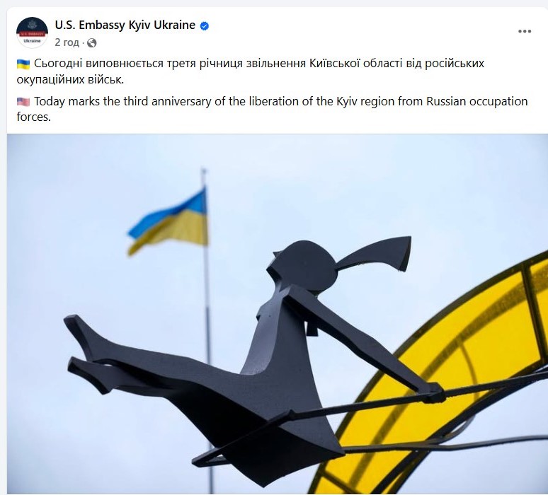 «Сьогодні виповнюється третя річниця звільнення Київської області від російських окупаційних військ», – йдеться у дописі на сторінці посольства США в Україні.
