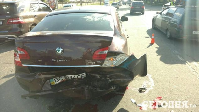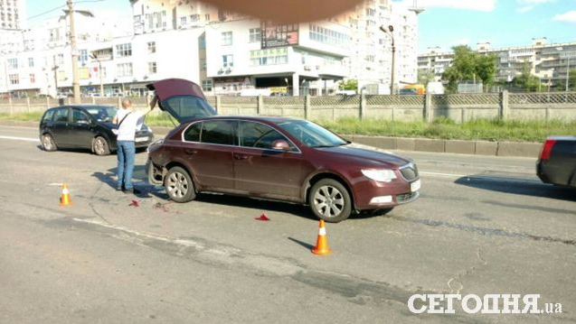 Як передає кореспондент Сегодня.ua, водій БМВ Х5 «закарбувала» чоловіка в Шкоду Суперб і зник.