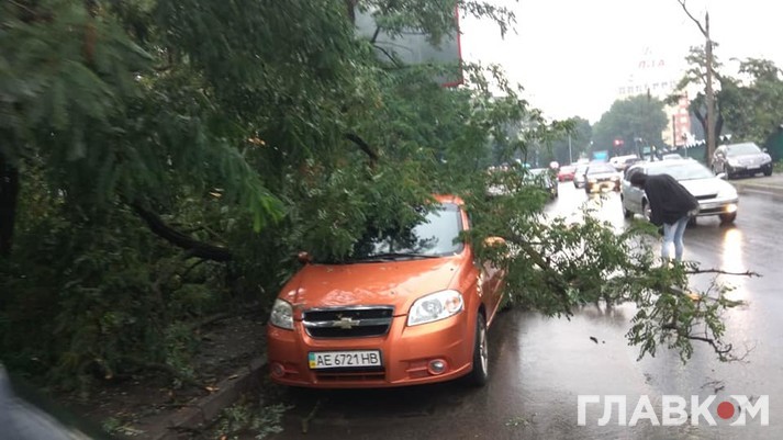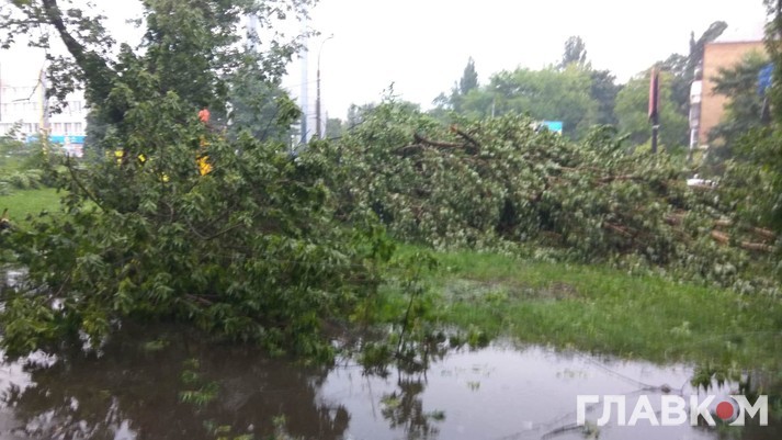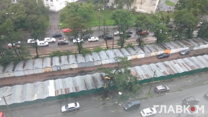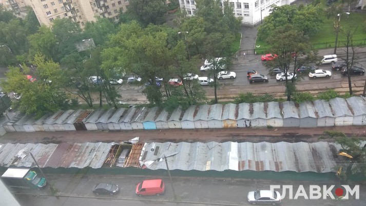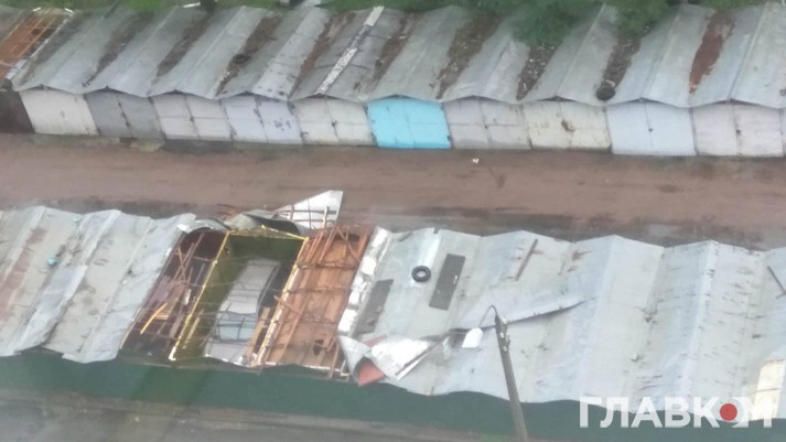 Також на вулиці Дегтярівській через сильний вітер було зірвано дахи з кількох гаражів. На дорогах багато поламаних гілок, є повалені дерева.