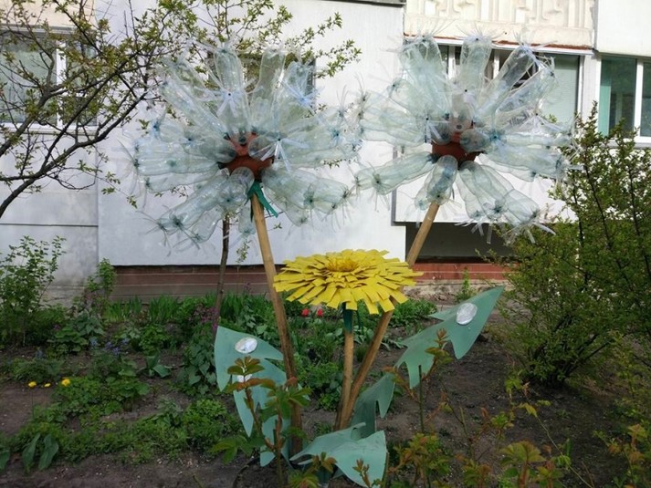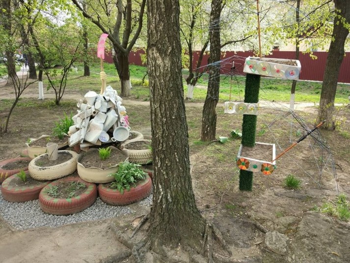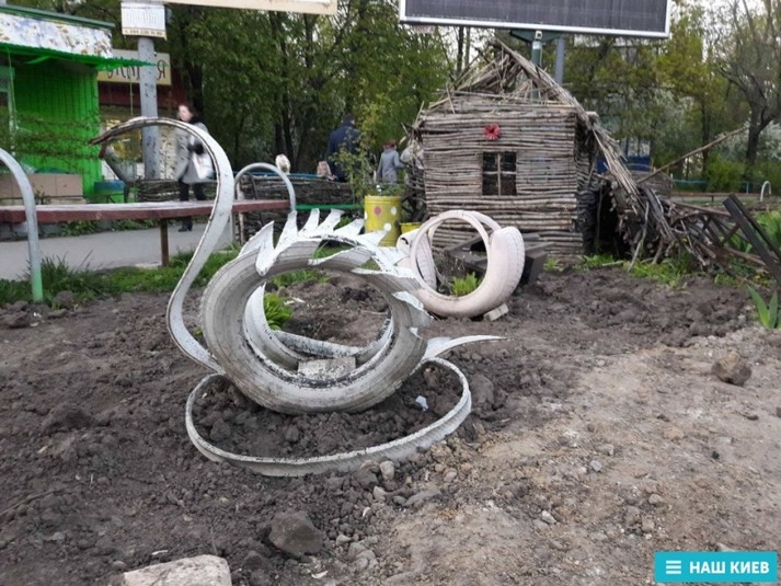 Чебурашка з каструль, гігантські кульбаби з пластикових пляшок, прикраси зі старих дисків — таке застосування кияни знайшли для непотребу. Все, що шкода було викинути, знесли на дитячий майданчик - господарський народ.