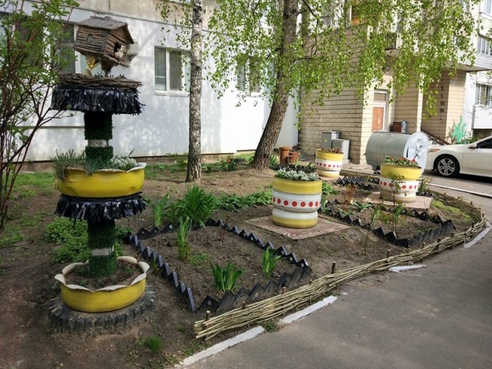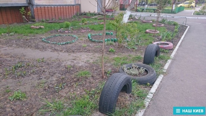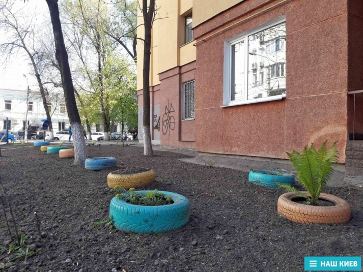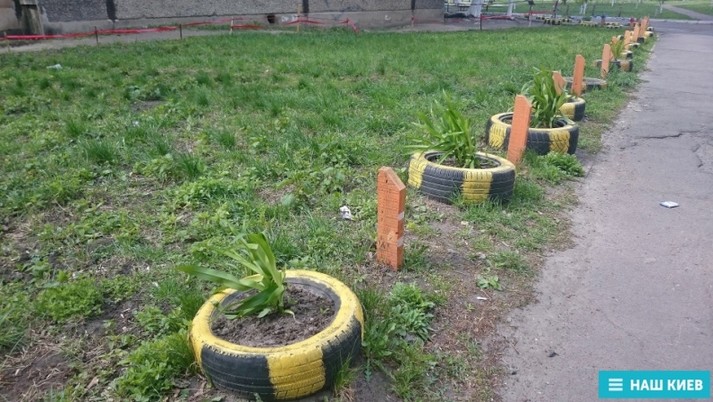 Шини — найпопулярніший у місті будматеріал в спальних районах столиці. Вони стають і огорожею, і діжкою для рослин, й іграшками для дітей.