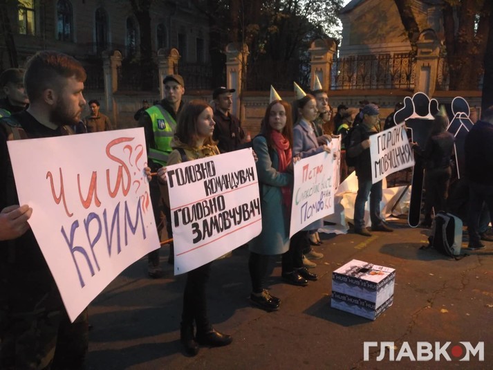 Журналісти тримають в руках плакати «Головно командувач – Головно замовчувач», «Гарант мовчання», «Чий Крим?», «Води в рот набрав», «Козинські шпилі».