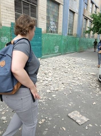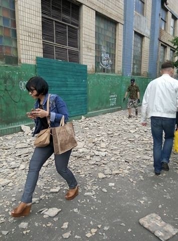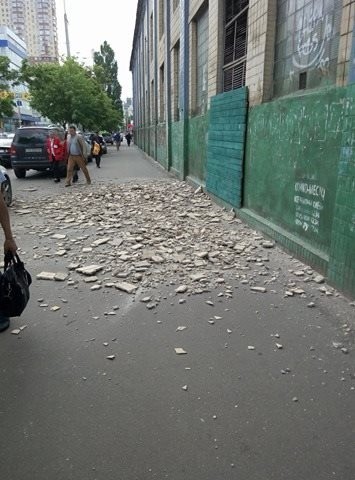 У Києві на Жилянській, 107 біля заводу «Ленінська кузня» на стіні будинку обвалилася стара плитка. Шматки впали на машини і на перехожого.