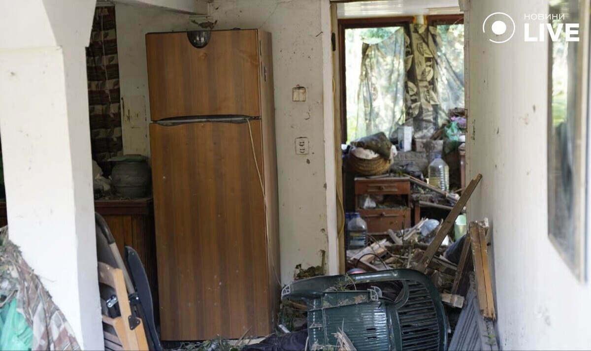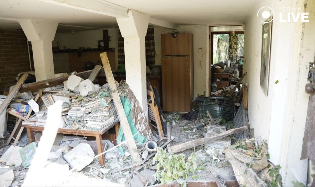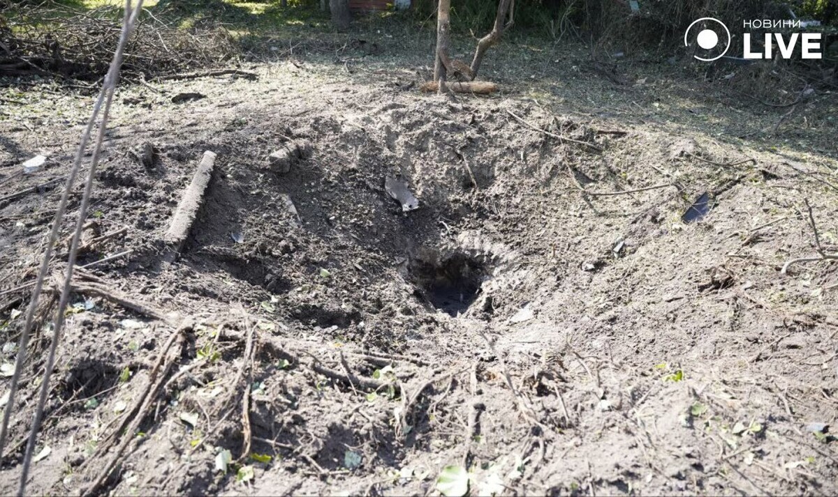 Внаслідок падіння дрона будинок зазнав значних руйнувань: розбиті стіни, розтрощені меблі, а посеред двору видніється величезна вирва.