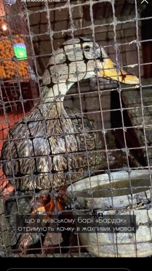«Бідолашну водоплавну птаху помістили в маленьку клітку, щоби, ймовірно, якось урізноманітнити інтер’єр. Качку тримають без доступу до денного світла та без обов’язкової для водоплавних птахів купальної канавки, яка має бути завширшки мінімум