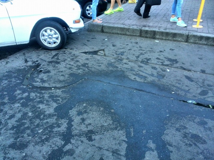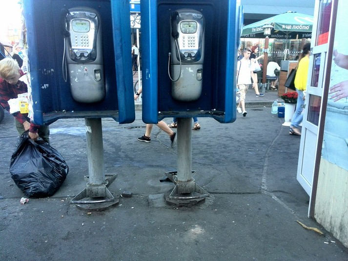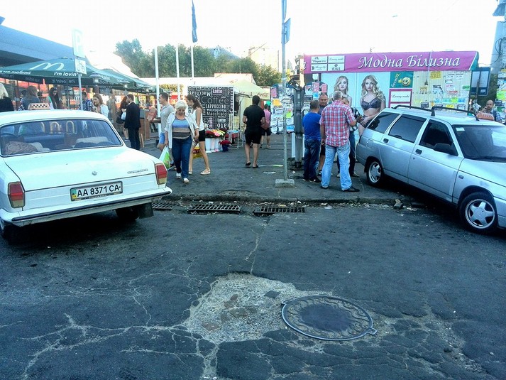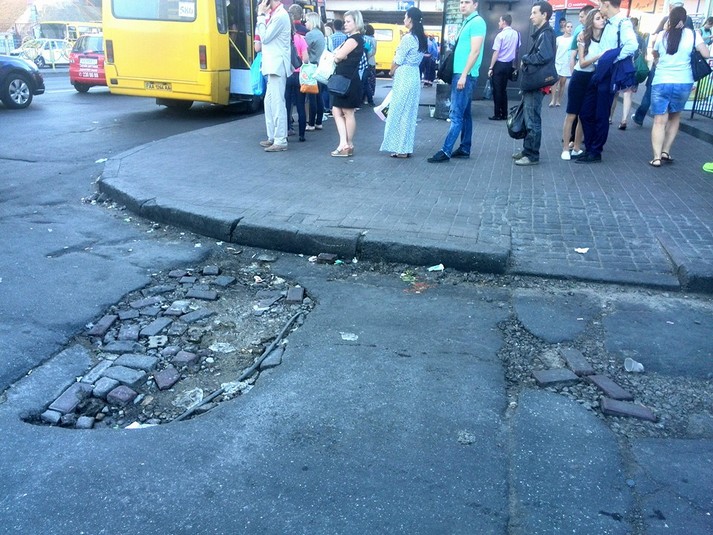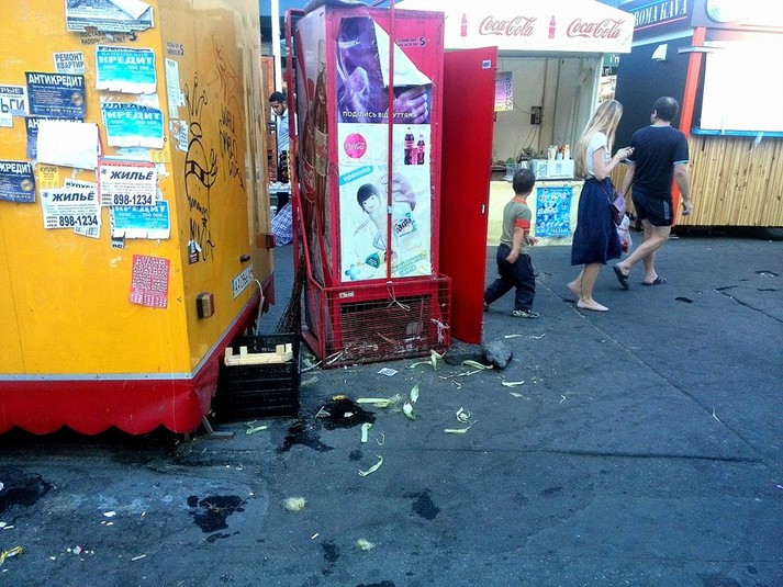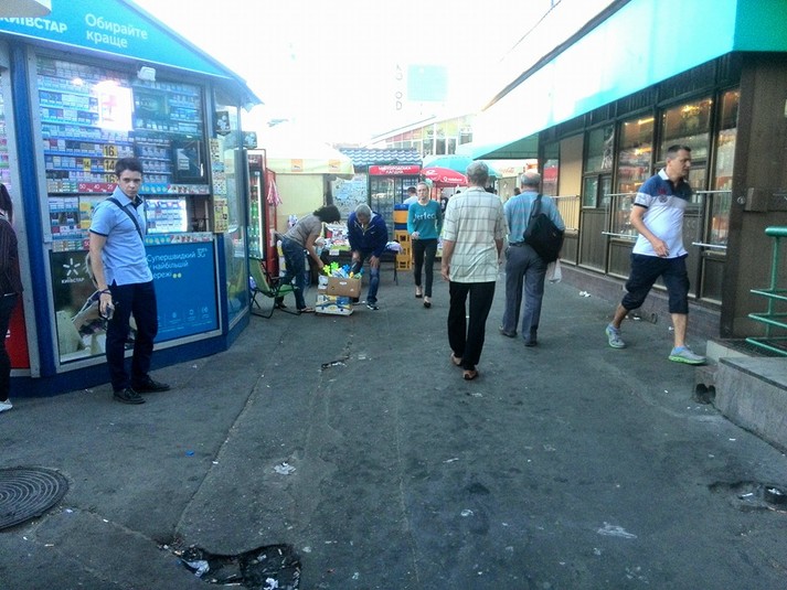 «Это вход в метро Левобережная. Через восемь месяцев совсем рядом, метров пятьсот где-то, пройдёт конкурс Евровидение. Где то за месяц до конкурса городские власти в суматохе будут все это убирать, класть новую плитку, красить бордюры. Ещё через месяц тут снова будет то что на фото».