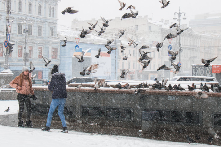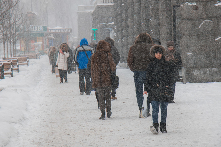 У суботу, 24 лютого, в Києві сльота і мокрий сніг. Незважаючи на це, на вулицях столиці багато людей. Хтось поспішає у своїх справах, а хтось просто неспішно прогулюється засніженими вулицями.