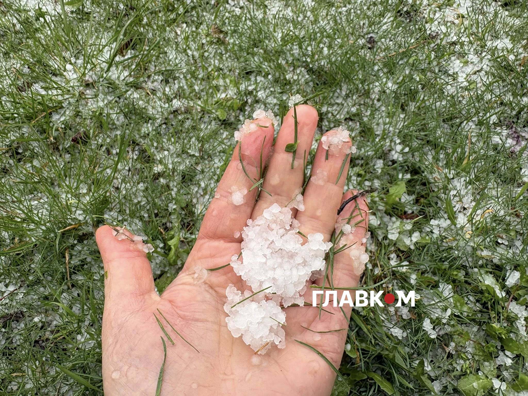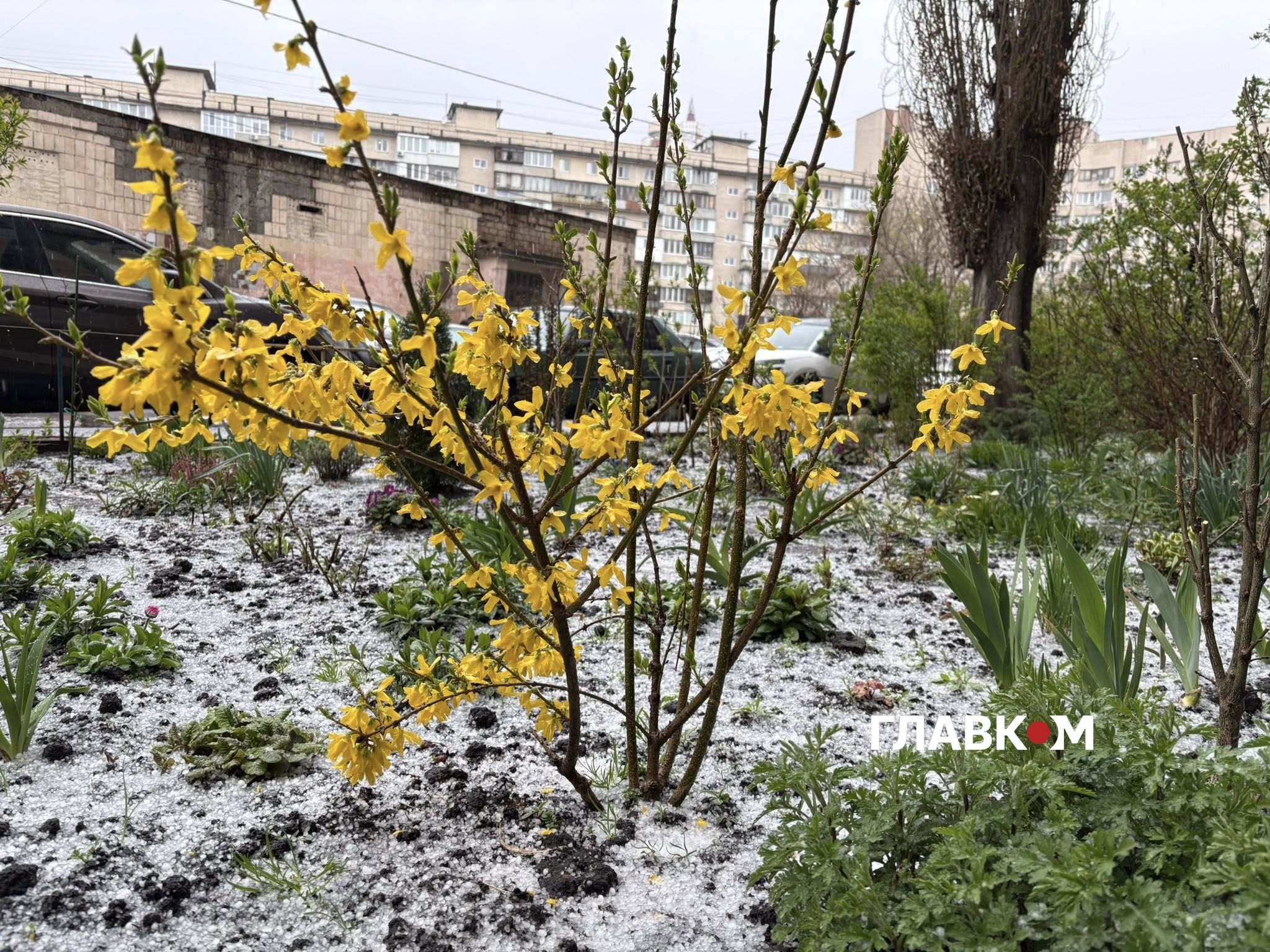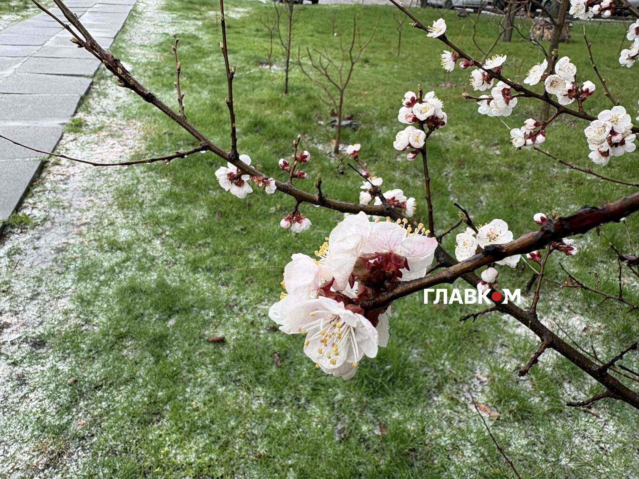 Дрібна крижана крупа за лічені хвилини вкрила газони та тротуари. На кадрах із місця подій видно, як білий шар льоду вкриває молоду зелену траву та перші весняні квіти, створюючи аномальний для середини квітня пейзаж.
