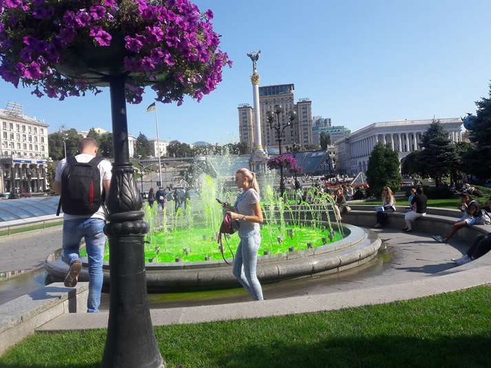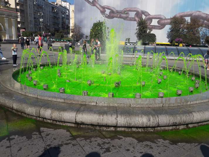 Сьогодні на столичному Майдані кияни та гості столиці побачили зелені фонтани.