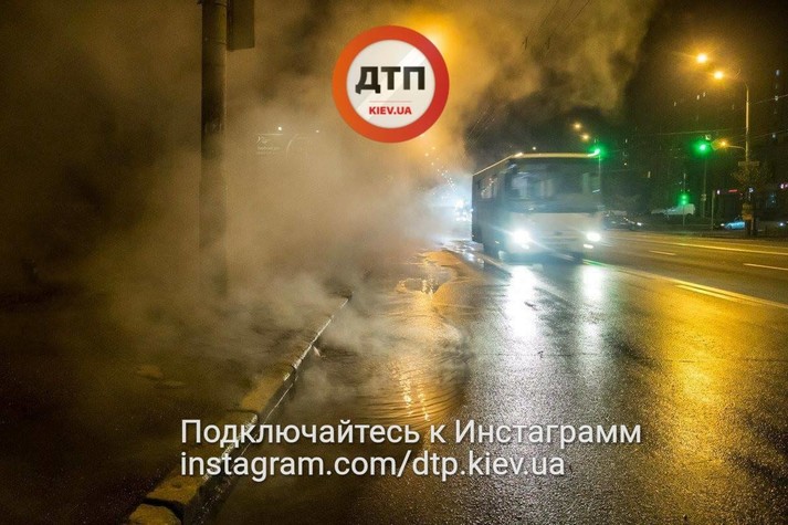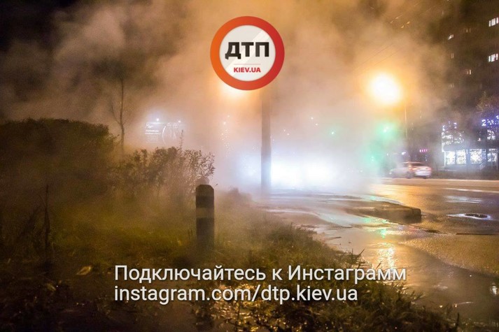 Увечері 12 жовтня на столичному проспекті Валерія Лобановського прорвало труби гарячого водопостачання. В результаті частина проспекту залило водою з каналізаційного люка. Від гарячої води в повітря піднявся пар.