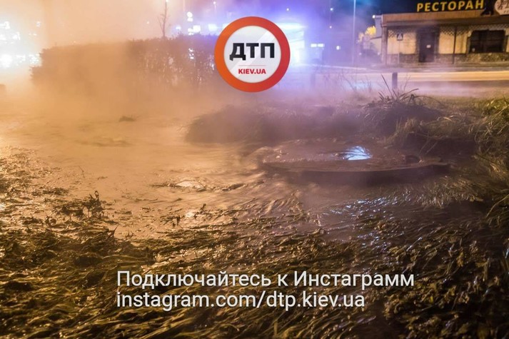 «Труби прорвало на проспекті Лобановського, 126 - навпроти заправки «ANP». До моменту приїзду журналістів на місце події, співробітників Солом'янського ЖКГ на місці не було. Ймовірною причиною інциденту може стати початок опалювального сезону.