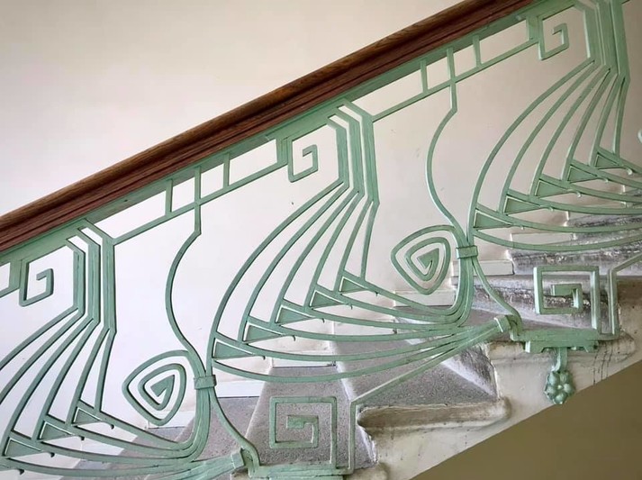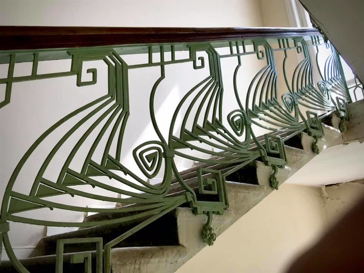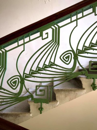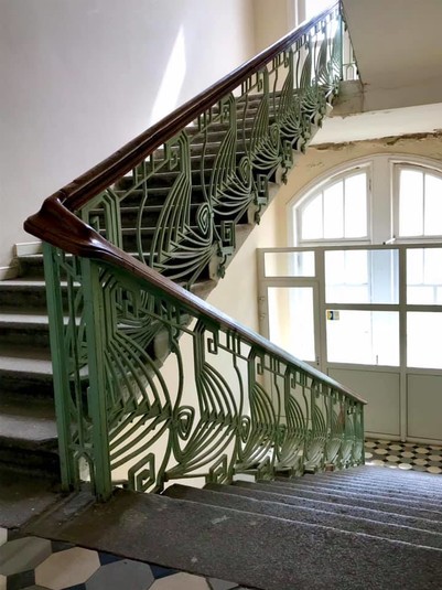 «Інтер’єр парадної сходової клітки з вестибюлем опоряджено у стилі модерн. На відміну від більш раціоналістичного оздоблення фасаду (весь декор виконано в цеглі), інтер’єр має ошатне флористичне ліплення на стінах. Також у стилі модерн виконано ковані елементи - огородження сходів та фрамуги над дверима ліфту. Малюнок огородження мені здався оригінальним - стилізовані зооморфні мотиви, що нагадують птаха (качку або голуба). Проте ще 1906 року такий малюнок огородження сходів з будинку у Берліні було опубліковано у німецькому журналі», – продовжив Короб.