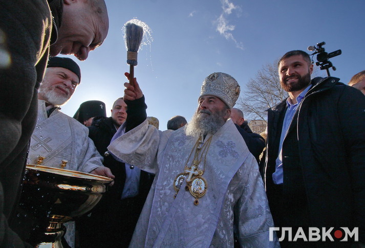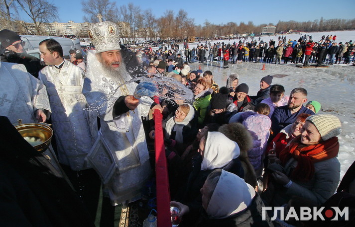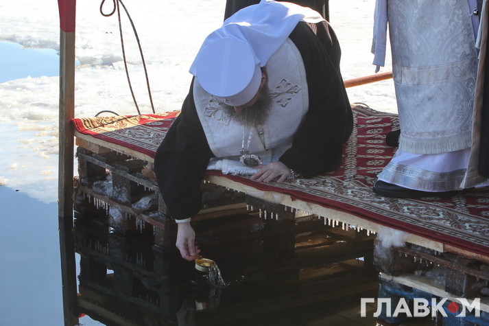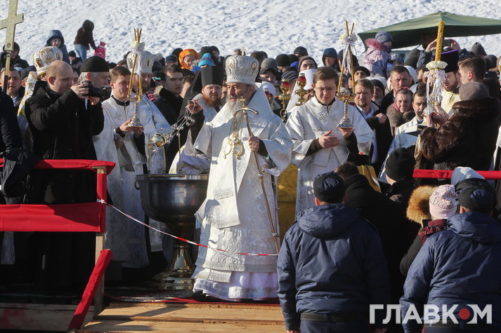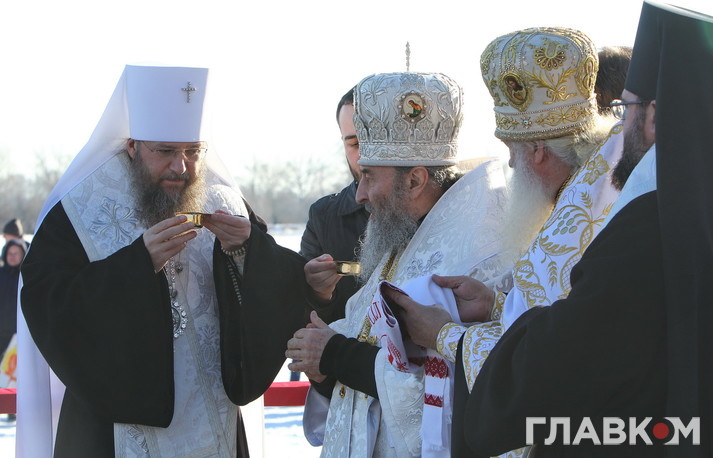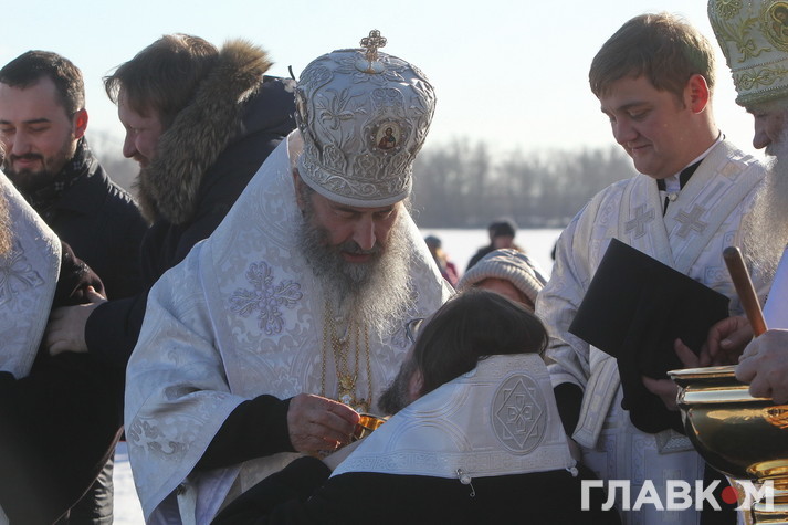 Предстоятеля РПЦ в Україні Онуфрія, який спустився до Дніпра супроводжували охоронці в одностроях «храмова варта» і «козацтво запорізьке». Очільник Московської церкви разом з іншими єпископами освятили воду в ополонці. Як і в минулі роки, місце освячення нагадувало церковний хрест.