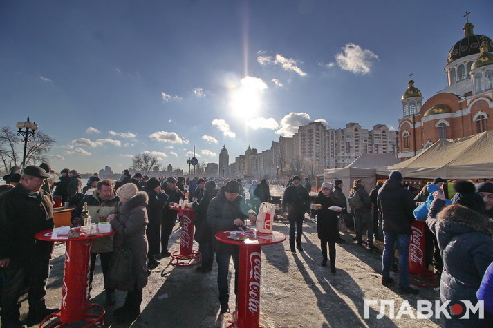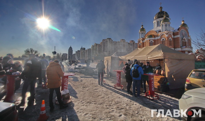 Кілька сотень українців традиційно зібралися у день Водохреща на Оболонській набережній біля Свято-Покровського собору. Люди розташувалися навкруги церкви із пляшками і бутлями з водою, аби священики її освятили.