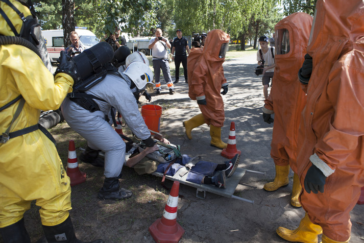 Постраждалого транспортували до палатки дезактивації, де в результаті обробки спеціальним розчином була нейтралізована дія хлору. Після цього йому надали невідкладну допомогу спеціалісти Центру екстреної медичної допомоги та медицини катастроф.