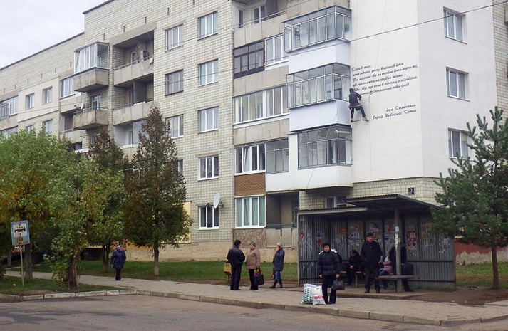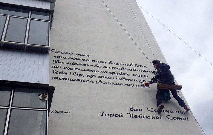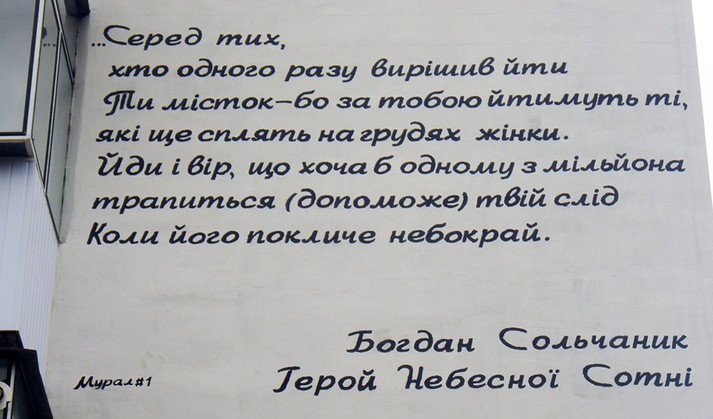 Цитату з вірша героя Небесної сотні Богдана Сольчаника волонтери зобразили на стіні багатоповерхівки