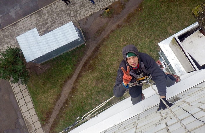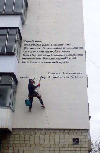 «9 рядків вірша героя Майдану Богдана Сольчаника ми писали протягом трьох днів. Чи вийшло – най оцінюють перехожі. Знаю одне: Орест дуже старався! Він щодня по 5 годин, висячи на висоті 3-го поверху, виводив кожну літеру. Його не можна було відволікати. Тож мені довелось побувати у ролі підсобника й охоронця», – написав Тарас Матвіїв на своїй сторінці у Facebook.