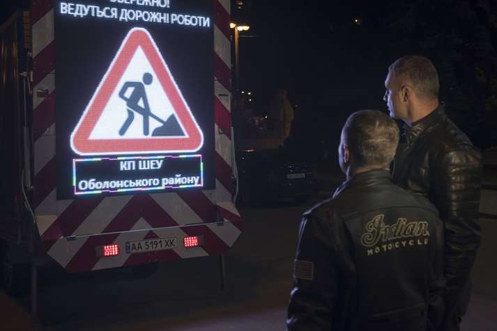 Окрім дороги і тротуарів у районі Солом’янської площі Віталій Кличко оглянув і новий причеп безпеки, який розробили київські дорожники. Замість звичних статичних конструкцій з лампами та дорожніми знаками, на столичних дорогах з'явилися причепи, на задній частині яких встановлені LED-монітори, куди виводиться інформація для водіїв.