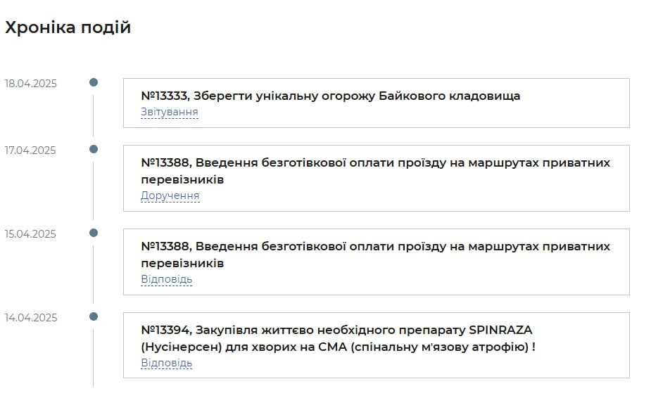 Також на сайті петицій у розділі «Хроніка подій» можна побачити хід розгляду, виконання та звітування щодо петицій, який постійно оновлюється.