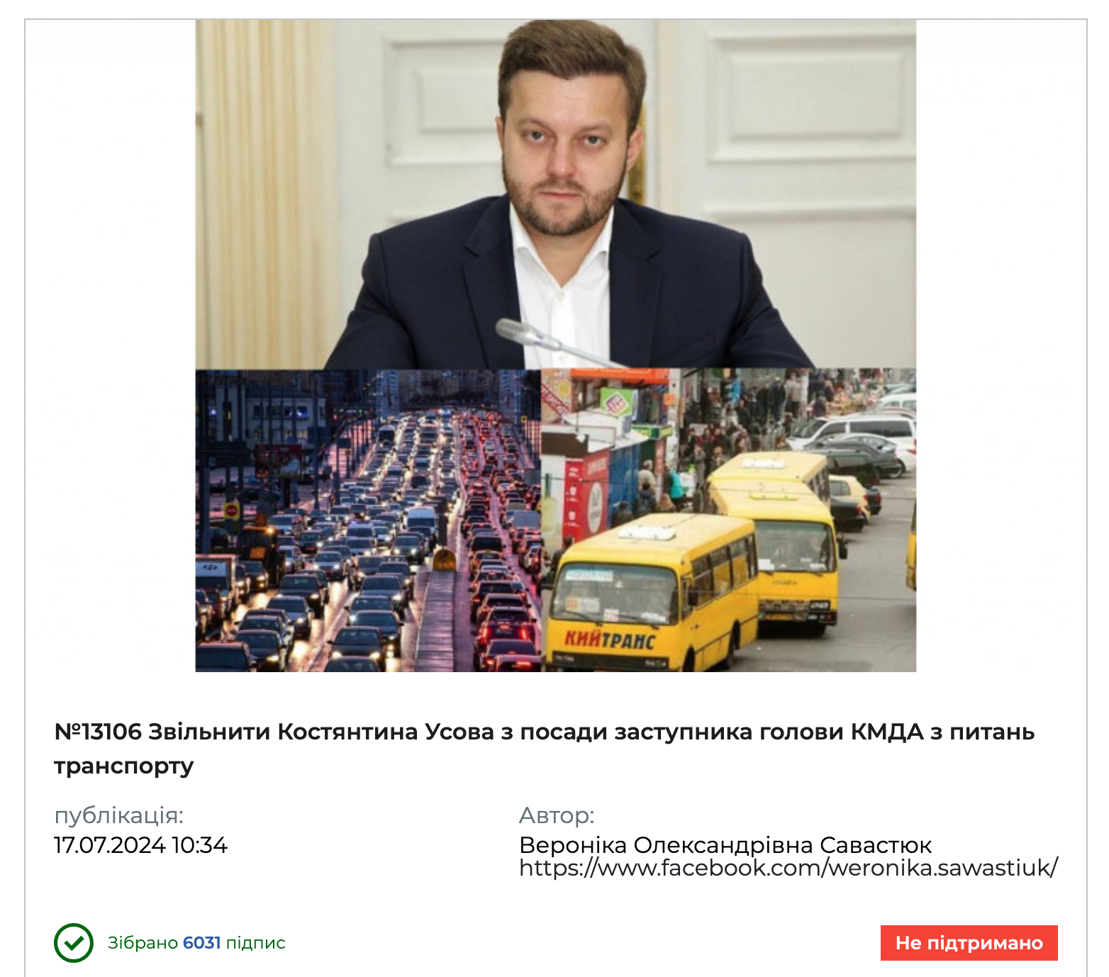 Була також і персоналізована петиція, що стосувалася звільнення депутата Київради від «Європейської Cолідарності» Костянтина Усова з посади заступника голови КМДА. Зокрема, в тексті авторка вказала, що Усов «відповідальний за транспортні колапси в місті» та згадала обшуки ДБР від червня 2024 року, які стосувалися вимагання неправомірної винагороди в одного зі столичних перевізників.