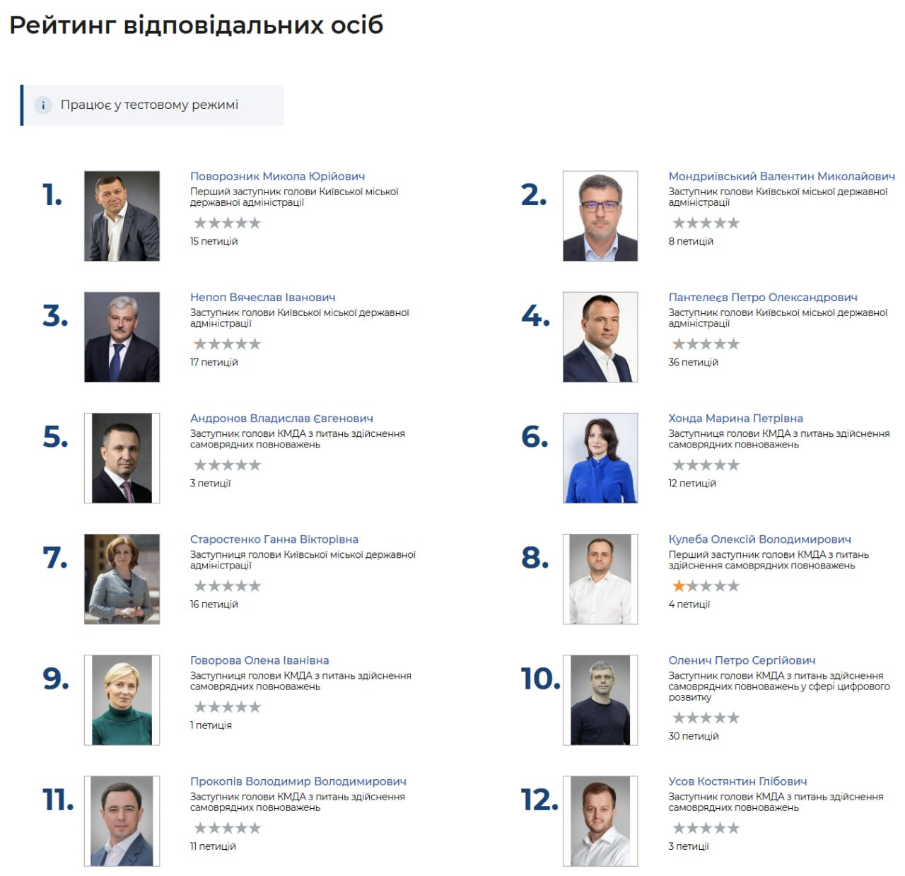 На сайті петицій до Київської міської ради є рейтинг відповідальних осіб щодо петицій, де вказані керівні особи Київської міськради, відповідальні підрозділи та кількість петицій. Цей розділ наразі працює в тестовому режимі. На сайті відсутня методологія формування цього рейтингу. Рух «Чесно» надіслав запит, щоб отримати роз'яснення, однак на час публікації відповіді не було.