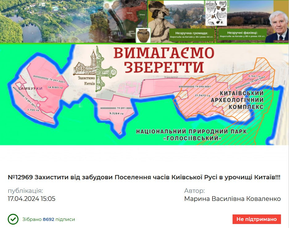 Зокрема, авторка петиції Марина Коваленко у своєму виступі стосовно збереження пам’ятки підкреслила: «Найпростішим способом для захисту Китаївського археологічного комплексу могло стати непродовження оренди для забудовника у 2024 році. Саме тому була створена петиція до Київради №12969, яка стала найбільш рейтинговою і яка зібрала 8692 голоси «проти оренди» в Китаєві, Самбурках, Болгарському. Але замість захисту інтересів громади, деякі депутати Київради навпаки сприяли забудовникам. Хоча вони повинні представляти інтереси громади, їхні рішення демонструють зворотнє. Так, депутати продовжили оренду на трьох ділянках у Китаєві (у Самбурках та Болгарському), попри результати голосування за петицію».