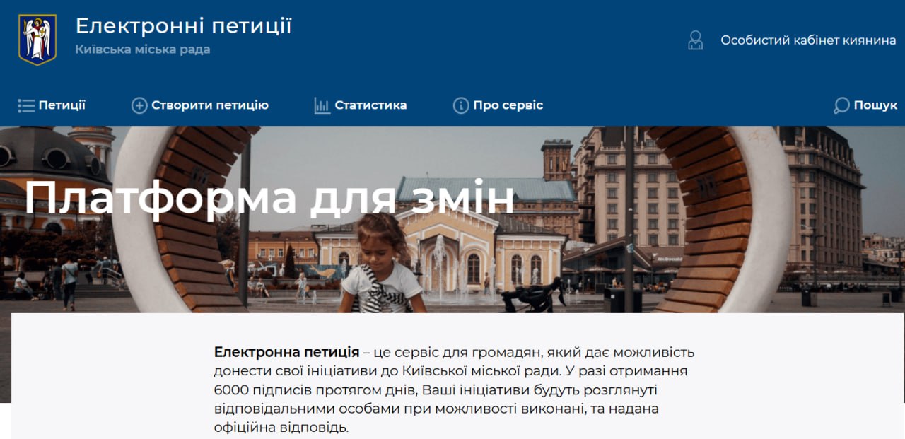 Київ був першим містом в Україні, в якому в 2015 році з'явилася електронна платформа, яка призначалась для того, щоб подавати петиції до міської ради. Ця ініціатива надала громадянам можливість долучитися до процесу ухвалення рішень і стала прикладом відкритого врядування в Україні. У перший рік роботи платформи громадяни подали понад 1326 петицій, 20 з яких набрали достатньо підписів для підтримки.