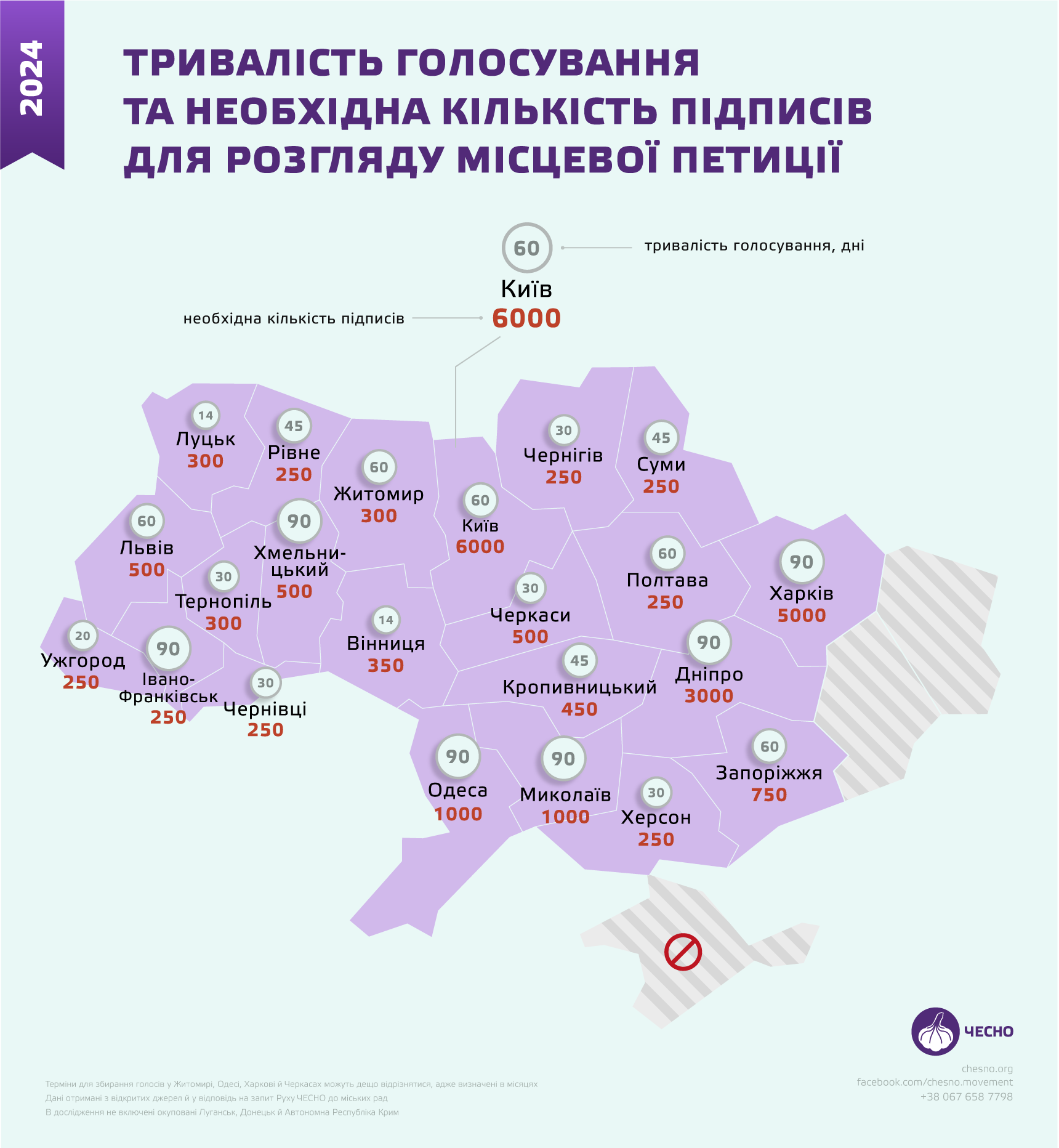 Загалом для підтримки петиції до Київської міської ради необхідно зібрати 6 тис. голосів протягом 60 днів. Цікаво, що в кожному місті кількість необхідних підписів відрізняється. Кількість голосів, які має набрати місцева петиція, відповідно до Закону України «Про звернення громадян», залежить від чисельності населення. Втім, місцеве самоврядування самостійно визначає конкретні цифри, а закон встановлює лише нижній поріг. У разі, якщо буде отримано 6 тис. підписів для петиції до Київської міської ради, її мають розглянути протягом 10 робочих днів та надати офіційну відповідь автору.