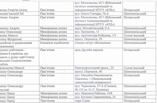 Щоправда, під час голосування із цього «чорного списку» викинули 13 об’єктів – зокрема, пам’ятник Михайлу Булгакову, танк на проспекті Перемоги і герб СРСР на щиті монумента «Батьківщина-мати». При тому, що українці майже одноголосно, під час опитування, висловилися за те, що радянському гербу не місце на монументі і його треба замінити на тризуб.