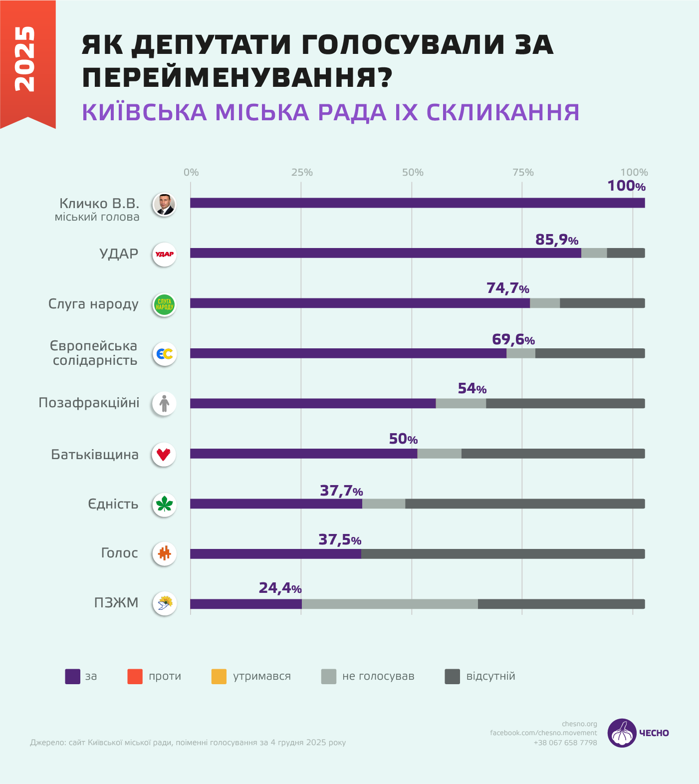 Протилежна ситуація спостерігається у ПЗЖМ. Нагадаємо, що група сформувалася на основі обраних від проросійської партії ОПЗЖ після її заборони. Депутати голосували «за» перейменування лише в 24,4% випадків, тоді як показник «не голосував» був більш ніж у півтора рази більшим – 38,9%. Рух «Чесно» регулярно зауважує, що в обов’язки депутата входить голосувати «за», «проти» або «утримався». Такої участі, як «не голосував», не передбачено зовсім.