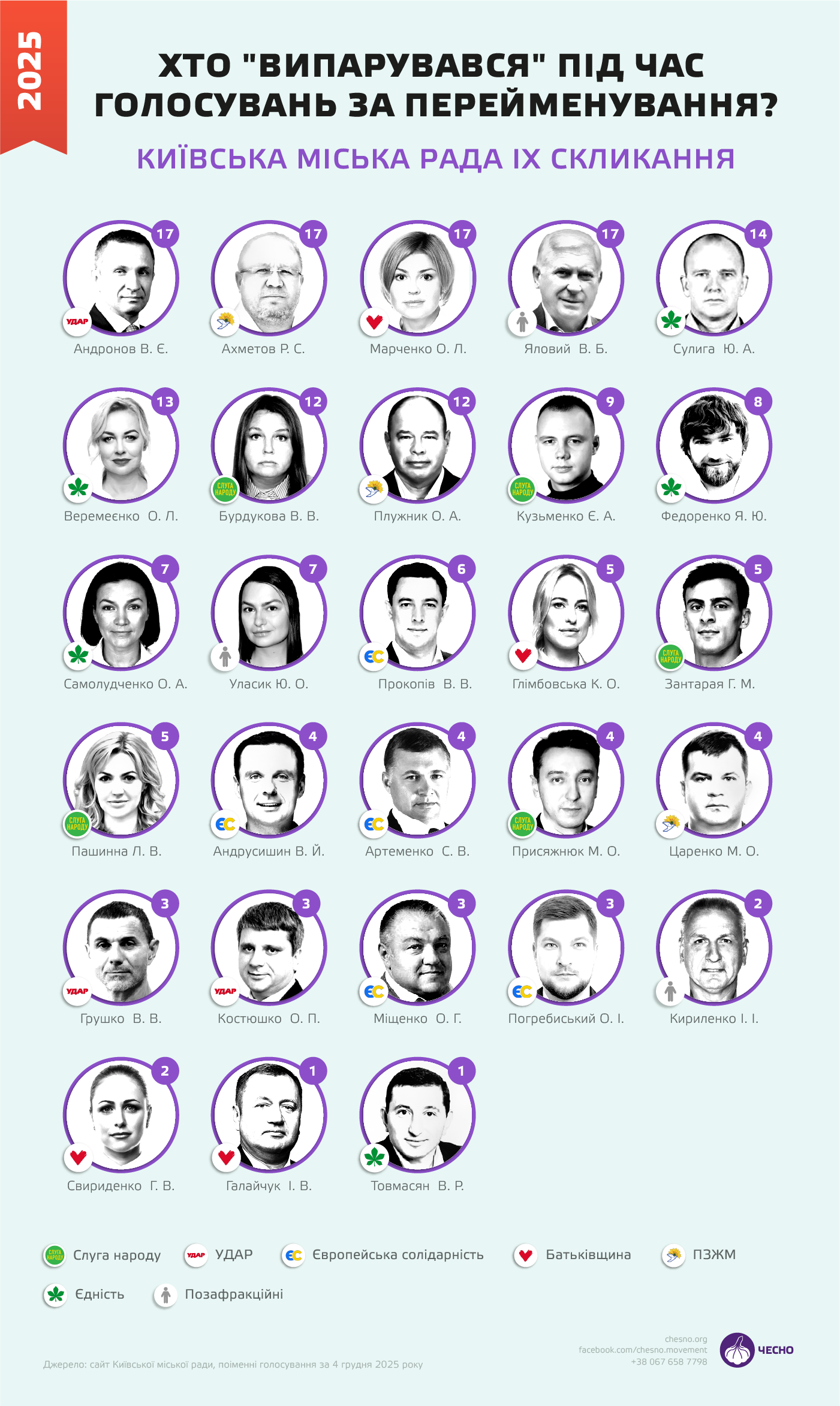 Найбільше голосувань пропустили Рустем Ахметов із ПЗЖМ, Олена Марченко з «Батьківщини» та Владислав Андронов із «Удару». Усі вони проголосували «за» перший проєкт у пакеті, а на результатах 17-х інших позначені відсутніми. У позафракційного Володимира Ялового навпаки – депутат підтримував проєкти до початку блоку перейменувань і потім з’явився лише на останнє голосування в ньому. Натомість раніше згаданий Ваган Товмасян із «Єдності» «випарувався» лише на одному з голосувань, а в 16-х інших проєктах позначено, що депутат «не голосував».