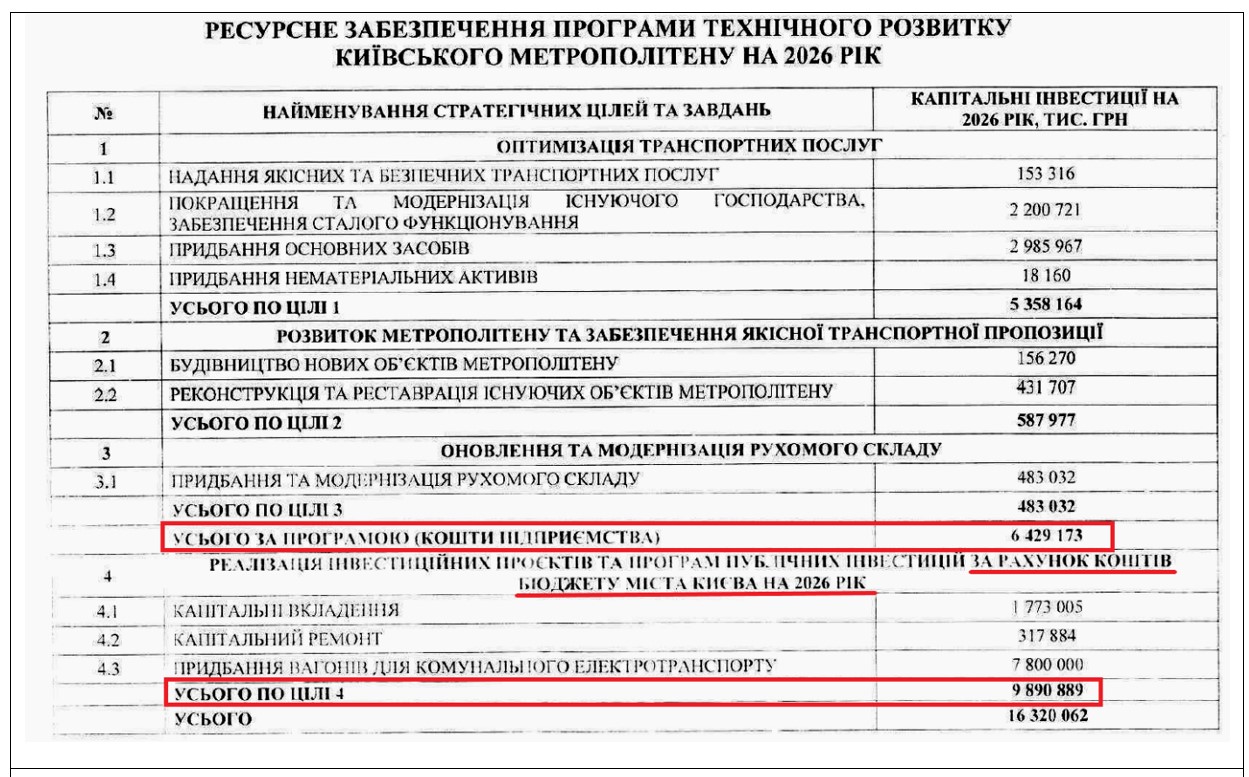І не варто чекати, що під анонсоване підвищення тарифу такі ігри припинять. Є всі підстави стверджувати, що на 2026 рік амортизацію вже дуже суттєво накрутили. Якщо за фінансовими звітами комунального підприємства собівартість перевезення одного пасажира у 2025 році склала 42,25 грн, то КМДА повідомила про планову собівартість в цьому році на рівні 64.53 грн. Так саме на цей рік заплановано і зростання собівартості в півтора раза у фінансовому плані комунального підприємства – з 10 до 15 млрд.