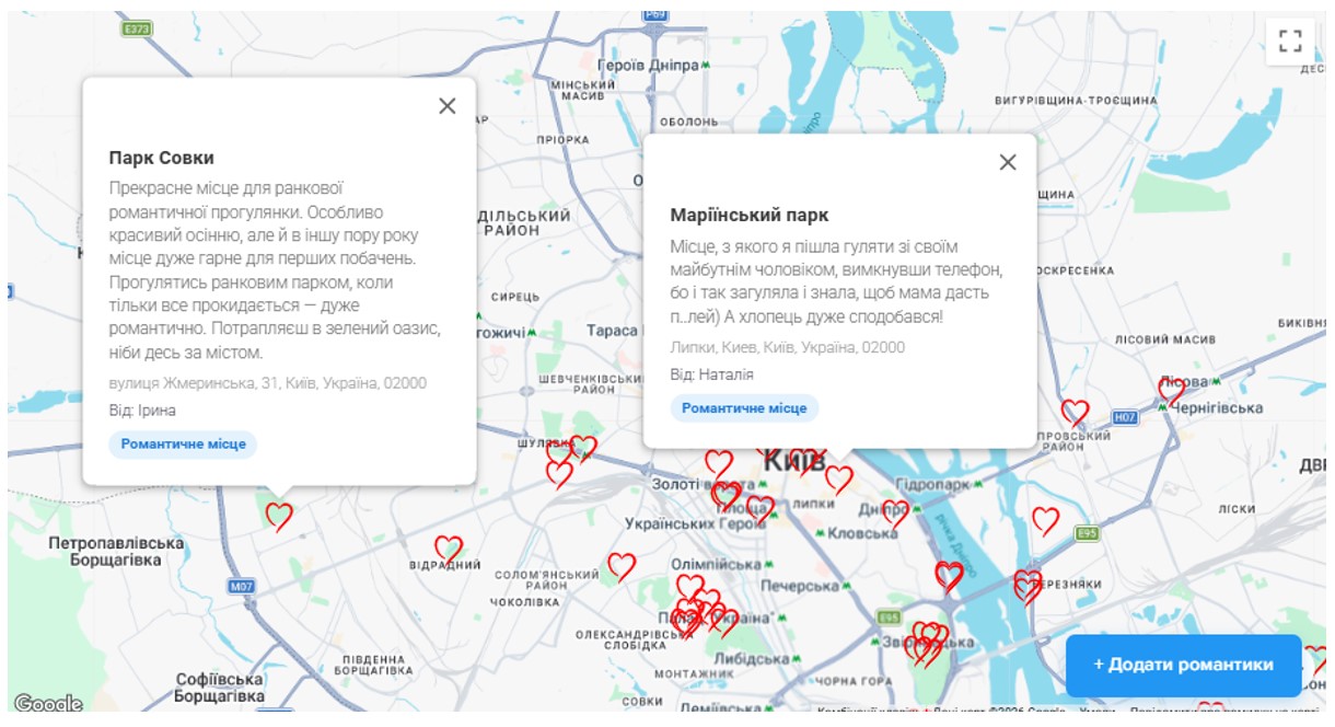 Наразі створена мапа столиці, на якій всі охочі можуть зробити позначку-сердечко і коротко написати про свою романтичну історію чи просто описати свої відчуття, які виникають під час прогулянок Києвом.