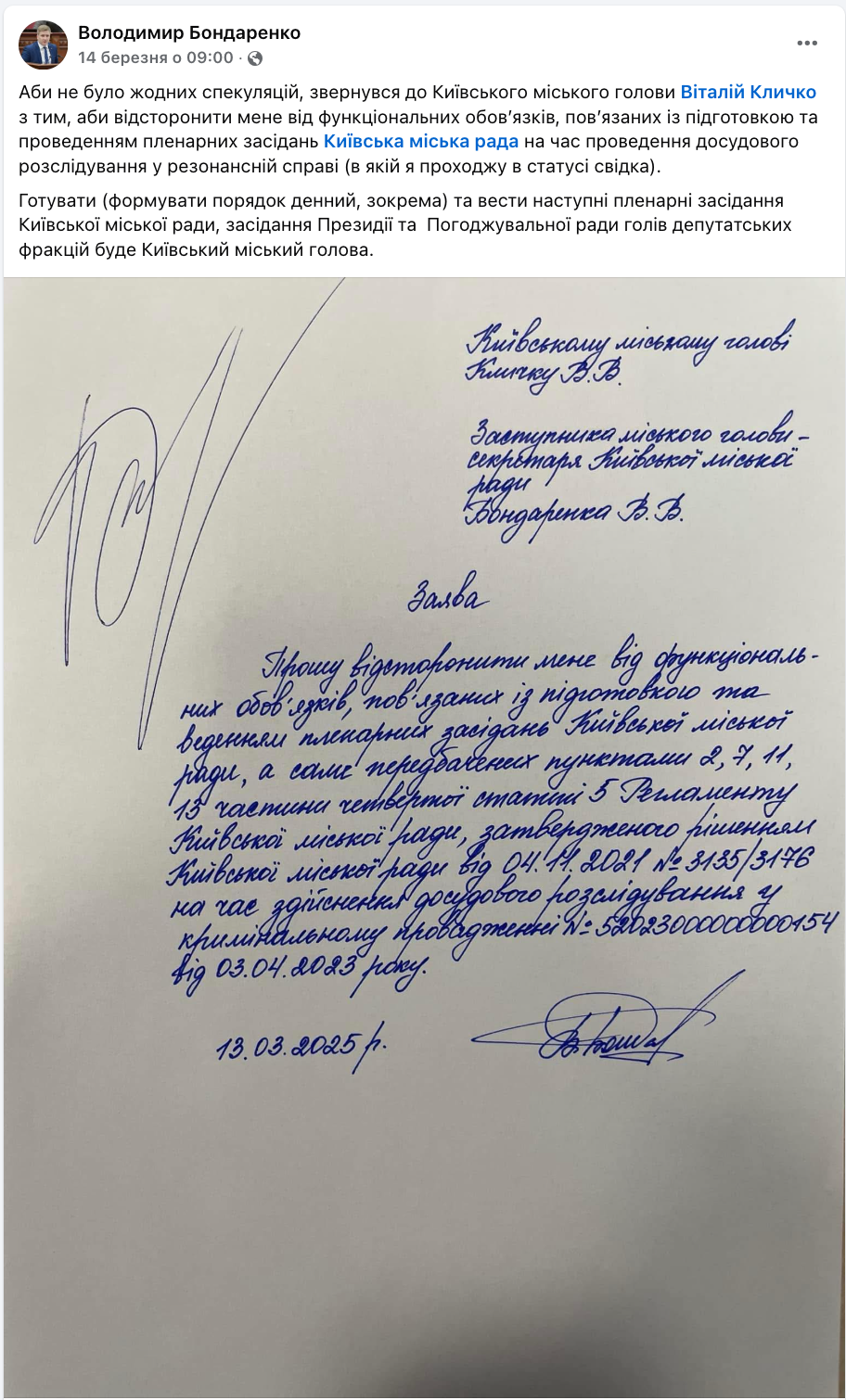 На додачу до блокування трибуни та наслідків земельних скандалів, відкритим запитанням на засіданні 3 квітня залишається й те, хто буде проводити його. Адже секретар Київради Володимир Бондаренко, який також фігурує у «плівках Комарницького» написав заяву на відсторонення від підготовки та проведення пленарних засідань. Тож попередньо, цим наразі має займатися міський голова Віталій Кличко.
