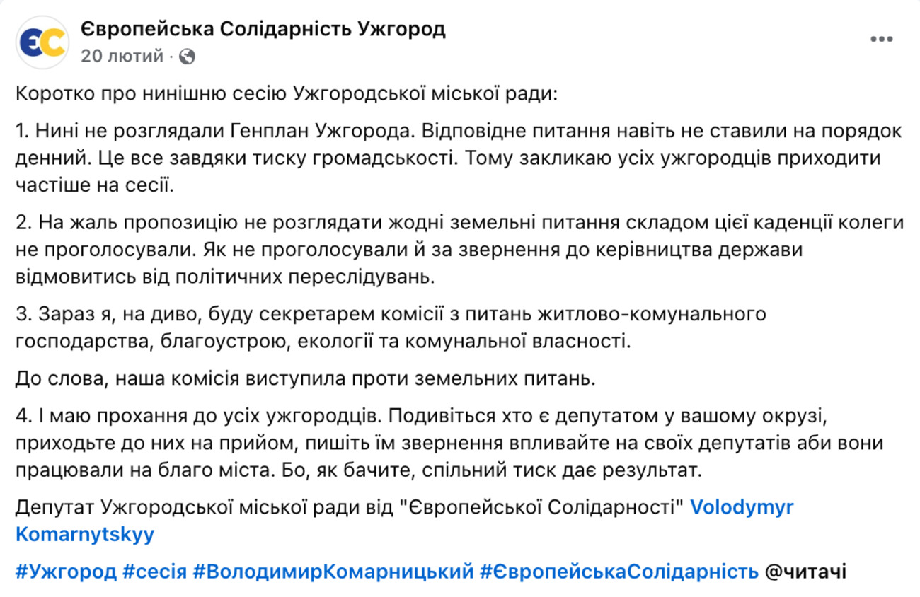 Так, зокрема, в Ужгородській міській раді проєкт рішення про «політичні переслідування» не включили до порядку денного під час засідання 20 лютого, про що йшлося й у повідомленні «Європейської солідарності» на Facebook. Проте засідання продовжилося у звичному режимі.