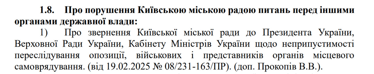 У відповідь на це депутати «Європейської Солідарності» в Київраді зареєстрували проєкт рішення «Про звернення Київської міської ради до Президента України, Верховної Ради України, Кабінету Міністрів України щодо неприпустимості переслідування військових, представників органів місцевого самоврядування і опозиції».