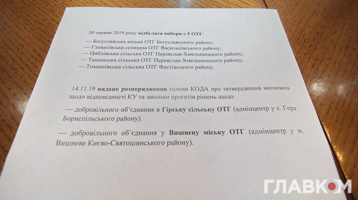 Ось покажу вам наш внутрішній документ. Правда, він постійно змінюється. Це поточна ситуація, бачення можливого варіанту створення ОТГ. Ми маємо план – 69 ОТГ на території області. Це проект змін до перспективного плану, який розроблений Київською обласною державною адміністрацією. Зараз він активно проходить процес обговорення.