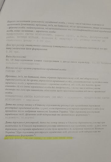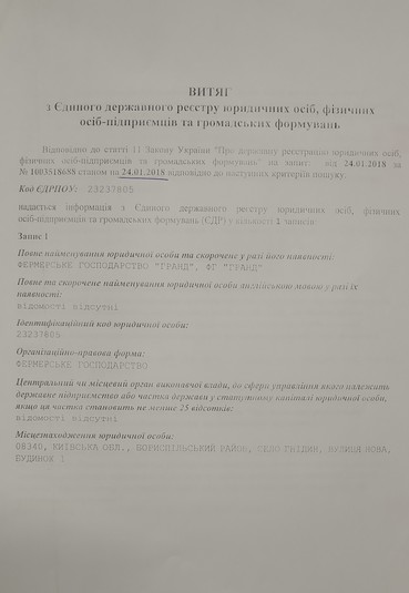 Під час переоформлення документів у лютому 2018 року жінка раптом дізналася, що право власності на земельну ділянку у фермерського господарства її сина «Гранд» придбала невідома Зінаїді Адамівні столична компанія зі співзвучною назвою: ТОВ «Фермерська компанія «Гранд КМ». Виявилося, що місяць тому ця фірма «уклала договір» купівлі-продажу ділянки з… померлим більше року тому Євгеном Кондратенком. Принаймні, про це свідчив підпис на документі повного тезки чоловіка.
