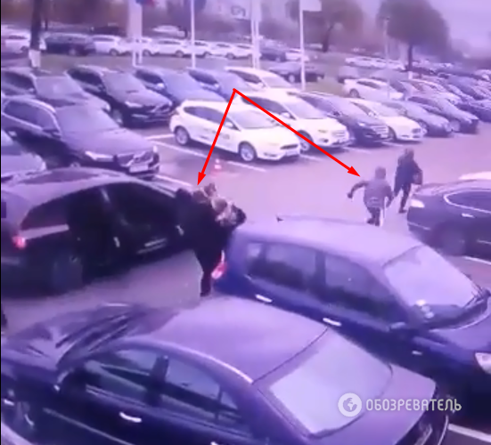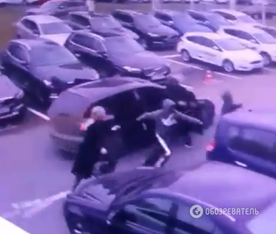 На відео видно, як поруч із перехожими (чоловіком і жінкою) зупинився легковий автомобіль. З авто вискочили троє людей у масках.