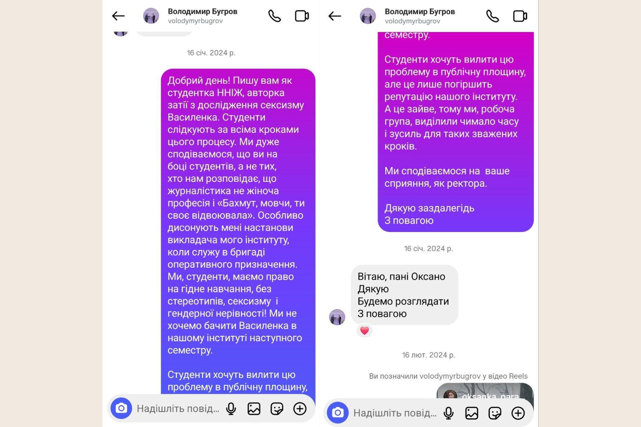 Комісія Вченої ради Університету з питань етики була скликана лише після скарги до омбудсмена від громадської активістки, колишньої студентки Навчально-наукового інституту журналістики Оксани Паращак. Складається враження, що студенти мусять «воювати» з адміністрацією, щоб чогось добитися…