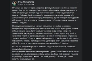 Розмови про те, що жінка має дочекатися свого воїна з фронту – це величезна маніпуляція. Нагадаю ще раз, що у стосунках беруть участь дві людини. І якщо одна людина з цих стосунків випадає через будь-яку причину: хворобу, війну, комп’ютерні ігри чи алкоголізм, то ці стосунки руйнуються. І жінка, так само, як і чоловік, мають право припиняти стосунки навіть під час війни.