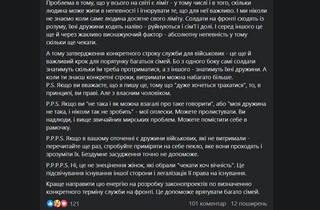 Але я би хотів щоби хоча б внутрішні ротації у середині підрозділу були офіційно затверджені. Бо ми відправляємо людей на 10 днів на передову, а вони готові навіть на два тижні піти, подвиг вчинити, якщо вони чітко усвідомлюють, що за два тижні їх заберуть з передової і відправлять на відпочинок. А таких гарантій поки дати ніхто не може, бо війна мінлива.