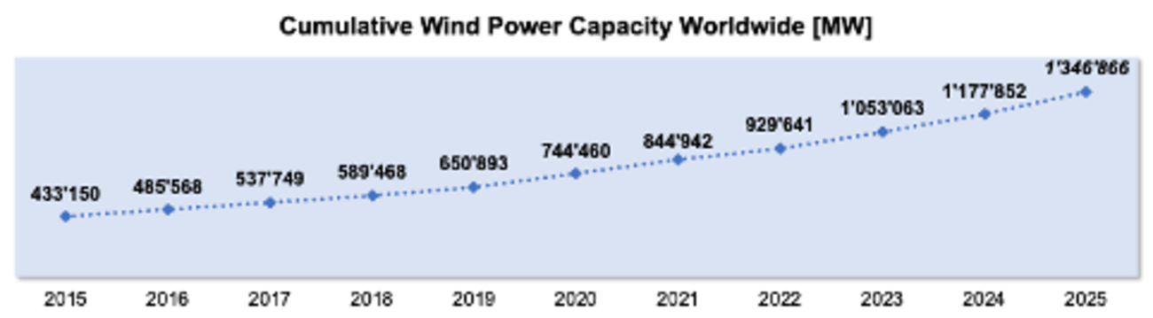 У 2025 році світова вітрова енергетика додала ще 169 ГВт потужності, що на 35% перевищує приріст 2024 року. Тож зараз глобальна потужність вітроенергетики перевищує 1346 ГВт. Про це свідчить нещодавній звіт Всесвітньої організації вітрової енергетики (WWEA), передає «Главком».
