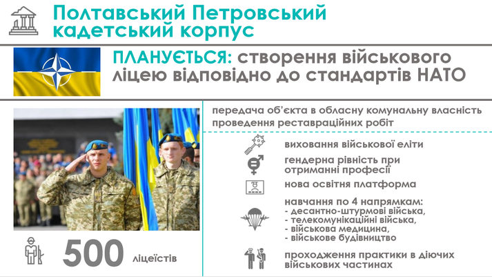 У Полтавському Петровському кадетському корпусі планується створити військовий ліцей за стандартами НАТО. У будівлі буде кілька приміщень: учбовий корпус, танцювальна зала, житловий корпус, адміністративна споруда, лазарет, офіцерський гуртожиток, гаражі та парковка.