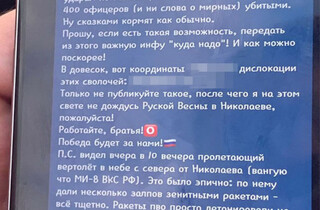 Раніше повідомлялося, що контррозвідники Служби безпеки України затримали місцевого мешканця, який ініціативно збирав і поширював в російських інтернет-спільнотах інформацію про позиції українських військ та об’єкти критичної інфраструктури у Миколаєві.