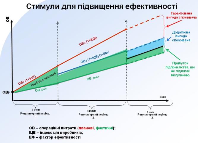 Третий важный элемент, который появляется впервые в этой методике, - это выгоды для потребителя. Суммы затрат населения изменяются в связи с инфляцией. По существующей модели у компании есть стимул снижать издержки. На следующем этапе половина выгоды в виде прибыли останется у компании, а вторая - у потребителя за счет снижения тарифа. То есть первое снижение тарифа произойдет за счет того, что та экономия, которой достигла компания, будет разделена между двумя участниками.