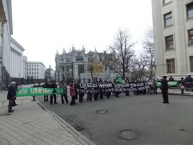 Тогда люди перешли на соседнюю улицу – под Администрацию Президента. Митингующие вывесили плакаты и транспаранты: «Свободу мирным собраниям жителям Киева!», «Нет коррупции в банковской системе Украины!», «Нет! Милицейскому беспределу в Киеве!».