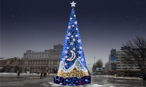 В новогоднем наряде донецкой елки будут присутствовать стилистически выраженные мотивы зимней украинской ночи. Звезды и полумесяц - доминирующие элементы на главном новогоднем атрибуте. Нижняя часть украшенной елки отдаленно напоминает очертание донецких терриконов, и в этом особа ее изюминка. Венчает новогоднюю красавицу вращающаяся звезда.