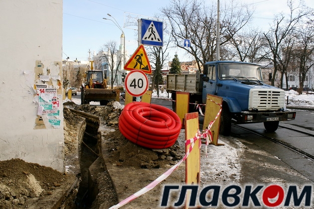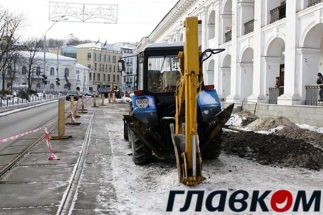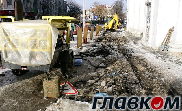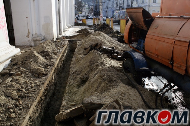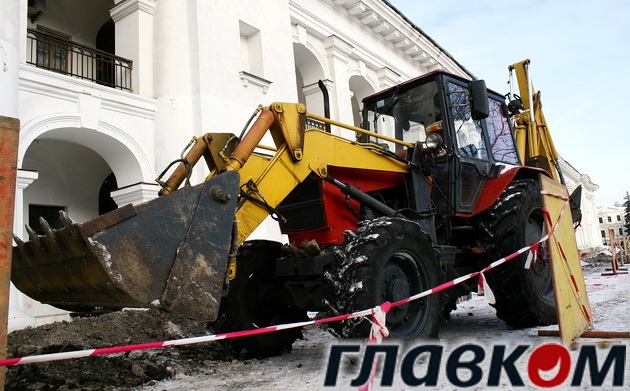 На территории Гостиного двора продолжаются реконструкционные работы. Вокруг здания прорыта траншея, в которой прокладывают силовой кабель.